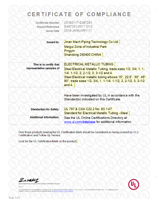 Meide Group has obtained the UL certification for 11.5° ERSC electrical conduits