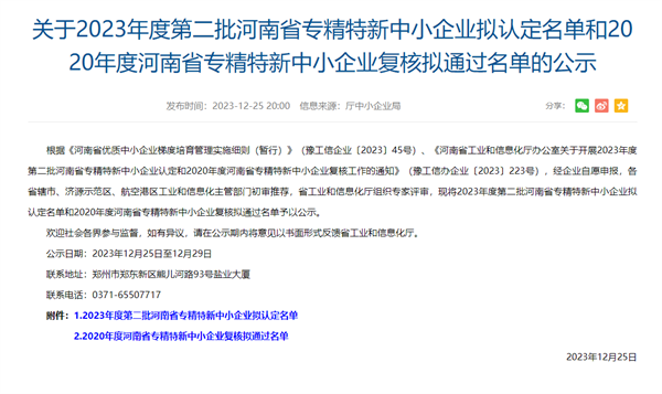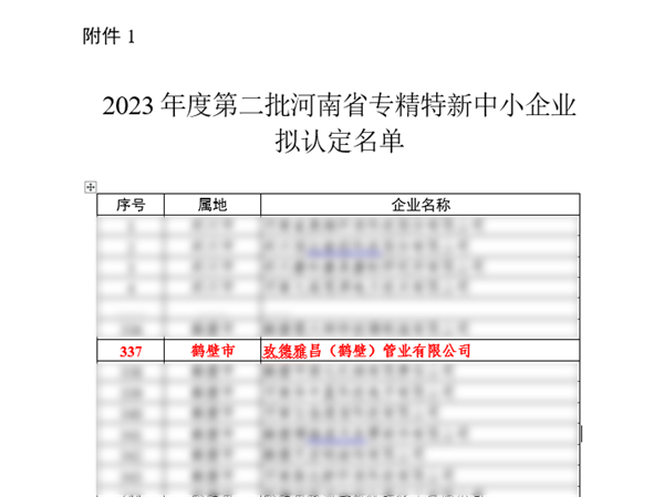 2023年12月25日,河南省工業(yè)和信息化廳發(fā)布《關(guān)于2023年度第二批河南省專精特新中小企業(yè)擬認(rèn)定名單和2020年度河南省專精特新中小企業(yè)復(fù)核擬通過名單的公示》。經(jīng)企業(yè)自主申報、嚴(yán)格審查、專家評選、審核復(fù)核等程序,玫德雅昌(鶴壁)管業(yè)有限公司順利通過認(rèn)定,成功入選河南省2023年專精特新中小企業(yè)。