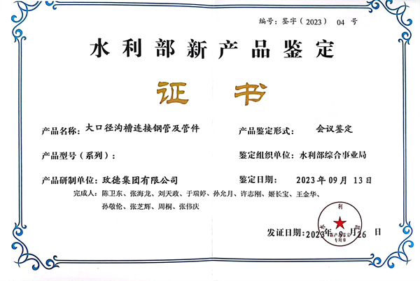 玫德集團(tuán)大口徑溝槽連接鋼管及管件產(chǎn)品得到了水利行業(yè)頂級專家的認(rèn)可,鑒定結(jié)論為:該產(chǎn)品加工技術(shù)及能力達(dá)到國際領(lǐng)先水平,產(chǎn)品達(dá)到國際先進(jìn)水平。得到了水利部領(lǐng)導(dǎo)及專家的一致認(rèn)可。