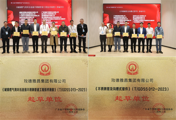 論壇期間,廣東省不銹鋼材料與制品協(xié)會特別為《城鎮(zhèn)燃?xì)庥铆h(huán)壓連接不銹鋼管道工程技術(shù)規(guī)程》和《不銹鋼管及溝槽式管件》兩項(xiàng)標(biāo)準(zhǔn)的審查人和起草單位頒發(fā)牌匾,以表彰在行業(yè)標(biāo)準(zhǔn)制定和技術(shù)進(jìn)步上所做出的卓越貢獻(xiàn)。玫德雅昌作為兩項(xiàng)標(biāo)準(zhǔn)的起草單位之一,榮獲嘉獎(jiǎng)。這不僅是對玫德雅昌在行業(yè)中影響力和專業(yè)地位的肯定,也是對企業(yè)持續(xù)在產(chǎn)品創(chuàng)新和技術(shù)研發(fā)上深耕細(xì)作的鼓勵(lì)。