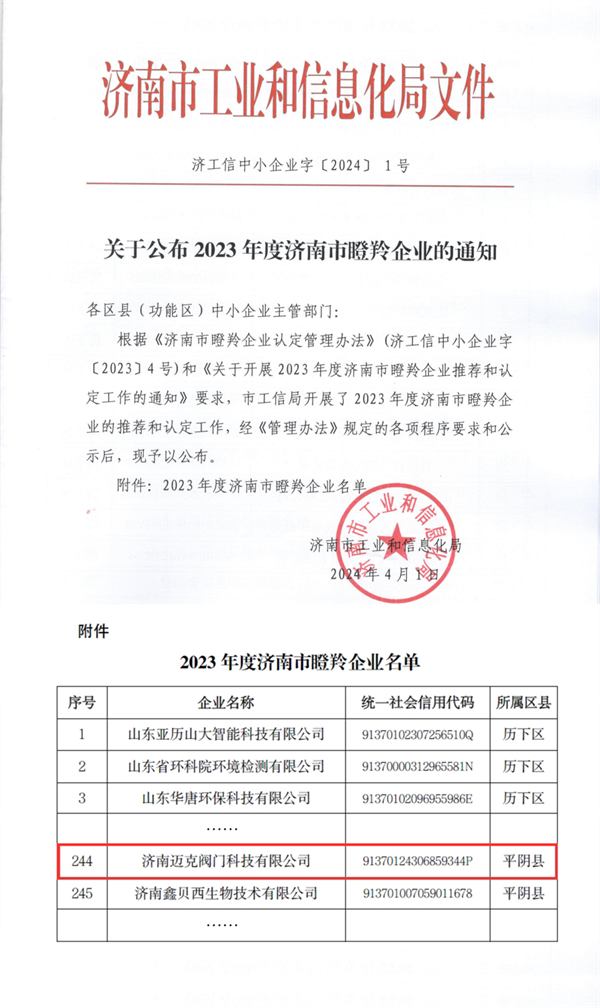 2024年04月07日,濟(jì)南市工業(yè)和信息化局發(fā)布《關(guān)于公布2023年度濟(jì)南市瞪羚企業(yè)的通知》,經(jīng)區(qū)(縣)中小企業(yè)主管部門(mén)初審、專家評(píng)審、現(xiàn)場(chǎng)第三方審核等重重審核,玫德集團(tuán)旗下邁克閥門(mén)成功通過(guò)2023年度濟(jì)南市瞪羚企業(yè)認(rèn)定。