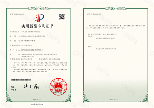 近日,經(jīng)國(guó)家知識(shí)產(chǎn)權(quán)局審批,臨沂玫德庚辰金屬材料有限公司自主研發(fā)并申報(bào)的“一種高溫沖渣水再利用裝置”成功獲得國(guó)家知識(shí)產(chǎn)權(quán)局授權(quán),并獲得實(shí)用新型專(zhuān)利證書(shū),專(zhuān)利號(hào)為:ZL 2023 2 2057025.2。