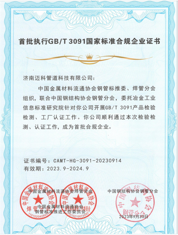 濟(jì)南邁科管道科技有限公司作為首批執(zhí)行GB/T3091國(guó)家標(biāo)準(zhǔn)合規(guī)企業(yè)之一,近年來(lái)積極參與標(biāo)委會(huì)各項(xiàng)國(guó)家和行業(yè)標(biāo)準(zhǔn)的制修訂工作,愿為鋼管行業(yè)的持續(xù)健康有序發(fā)展貢獻(xiàn)玫德力量!