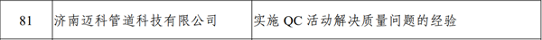近日,山東省工業(yè)和信息化廳公示了2024年全省質(zhì)量標桿典型經(jīng)驗名單,經(jīng)企業(yè)申報、有關(guān)部門推薦、專家論證等程序,濟南邁科管道科技有限公司《實施 QC活動解決質(zhì)量問題的經(jīng)驗》成功入選。