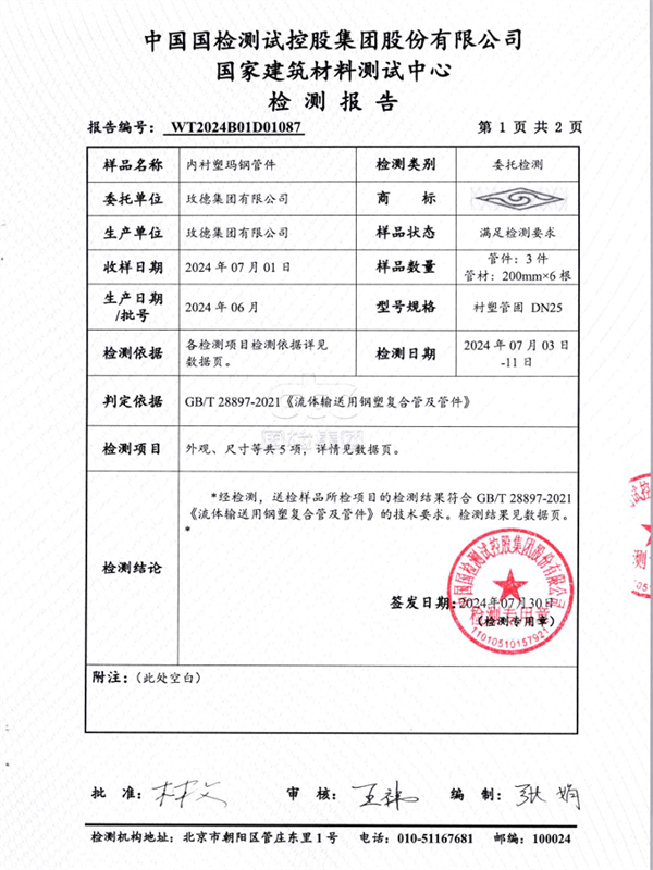 2024年8月,玫德集團有限公司“邁克”牌襯塑瑪鋼,通過GB/T 28897-2021《流體輸送用鋼塑復合管及管件》檢測。GB/T 28897-2021標準,對于規(guī)范流體輸送用鋼塑復合管及管件的生產(chǎn)、檢驗和使用具有重要意義。它不僅能夠提高產(chǎn)品的質(zhì)量和安全性,還能促進水務行業(yè)的健康發(fā)展。