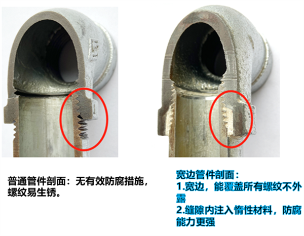 區(qū)別于傳統(tǒng)管件,玫德寬邊瑪鋼燃氣管件采用突破性的寬邊構造,能將所有螺紋緊密覆蓋,使其完全不外露。這一設計從根本上消除了因螺紋裸露,在長期使用過程中可能因磨損、松動而引發(fā)燃氣泄漏的風險。對比普通燃氣管件連接時,鋼管會有 2 - 3 扣螺紋暴露在外的情況,玫德管件的安全性得到了質(zhì)的提升。