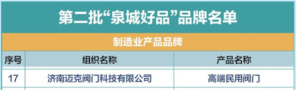 近日,濟(jì)南市第二批"泉城好品"名單正式公布,玫德集團(tuán)旗下邁克閥門憑借卓越的產(chǎn)品品質(zhì)和創(chuàng)新能力成功入選。這一榮譽(yù)不僅是對企業(yè)實(shí)力的肯定,也是玫德集團(tuán)六十余年匠心堅(jiān)守的又一注腳。