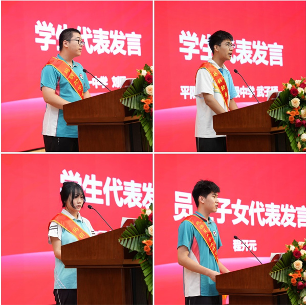 平陰一中劉旸、平陰實驗高中武子碩、平陰工業(yè)學校王國慶和玫德集團員工子女程開元作為學生代表分別發(fā)言,誠摯感謝玫德集團的鼎力支持,感恩瑪鋼助學基金二十年如一日的守護。他們表示,無論身在何方,都會做家鄉(xiāng)的宣傳者,做玫德精神的傳承者!