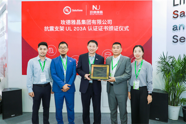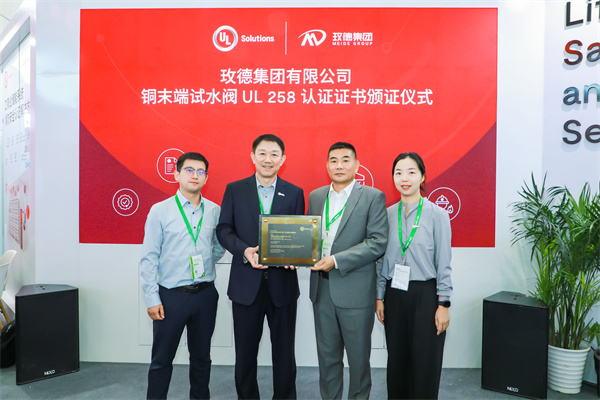 2025年10月13日上午,在第二十一屆中國(guó)國(guó)際消防設(shè)備技術(shù)交流展覽會(huì)UL展區(qū),一場(chǎng)隆重的認(rèn)證證書(shū)頒證儀式吸引了眾多參展商和專(zhuān)業(yè)觀眾的目光。玫德集團(tuán)在此榮獲UL Solutions頒發(fā)的三項(xiàng)重要產(chǎn)品認(rèn)證證書(shū),包括機(jī)械連接件UL 194認(rèn)證、抗震支架UL 203A認(rèn)證以及銅末端試水閥UL 258認(rèn)證。UL Solutions全球副總裁、中國(guó)大陸及香港地區(qū)總經(jīng)理吳大偉親臨現(xiàn)場(chǎng)頒發(fā)證書(shū),玫德集團(tuán)山東邁科智能科技有限公司高級(jí)副總裁李英兵代表集團(tuán)出席認(rèn)證證書(shū)頒證儀式,這一重要時(shí)刻見(jiàn)證了玫德消防產(chǎn)品在國(guó)際化征程上的新突破。