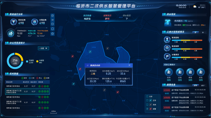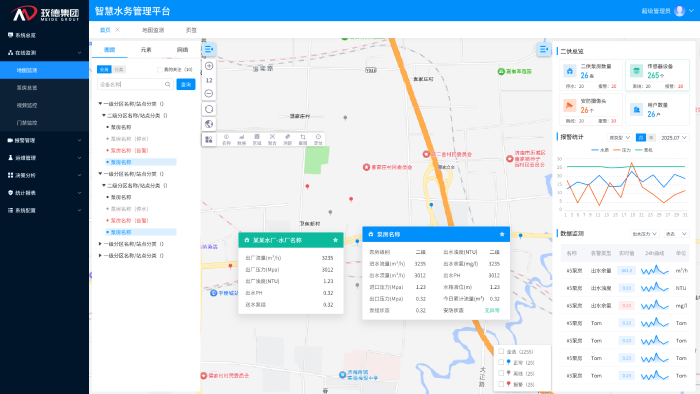 平臺(tái)看板集中展示水廠(chǎng)與泵房位置及運(yùn)行狀態(tài),實(shí)時(shí)監(jiān)控壓力、流量、水質(zhì)等20余項(xiàng)指標(biāo),支持按區(qū)域、時(shí)間、設(shè)備類(lèi)型多維度查詢(xún),各運(yùn)行參數(shù)一目了然,直觀(guān)顯示設(shè)備異常位置與狀態(tài),及時(shí)發(fā)現(xiàn)問(wèn)題并解決。