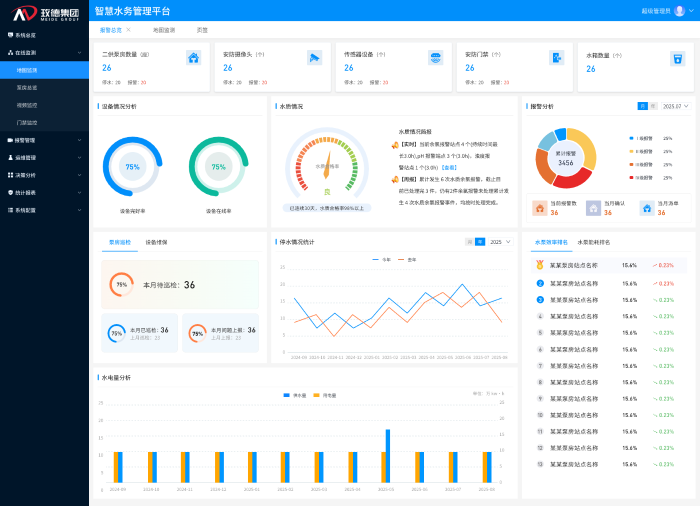 智慧水務(wù)平臺(tái)以數(shù)據(jù)集成與分析為核心,構(gòu)建了一套覆蓋供水系統(tǒng)全流程的數(shù)字化運(yùn)營(yíng)體系。該體系通過(guò)實(shí)時(shí)監(jiān)測(cè)、智能預(yù)警與閉環(huán)管理等功能,有效提升水務(wù)運(yùn)營(yíng)的透明度、效率與安全性,為管理人員提供全面的決策支持。平臺(tái)主要功能包括以下方面: