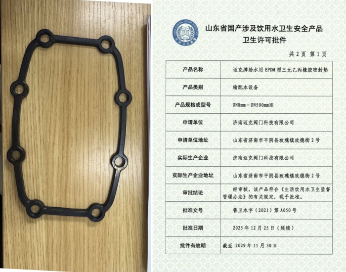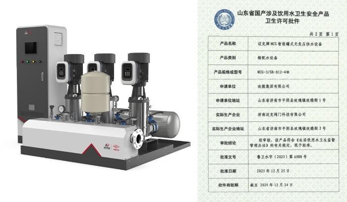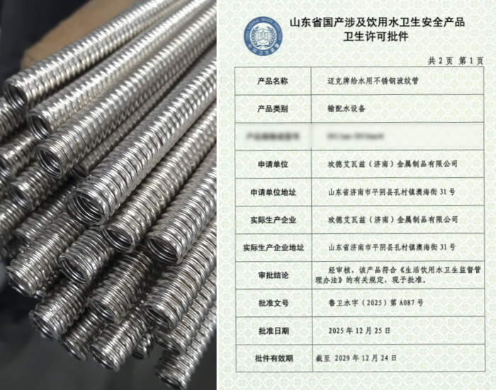 近日,玫德集團(tuán)旗下三類給水系列產(chǎn)品成功取得衛(wèi)生許可批件,標(biāo)志著集團(tuán)在民用及市政給水領(lǐng)域的合規(guī)性與安全性獲得權(quán)威認(rèn)可。本次獲批產(chǎn)品包括:玫德集團(tuán)有限公司生產(chǎn)的“邁克牌MCG智能罐式無(wú)負(fù)壓供水設(shè)備”、濟(jì)南邁克閥門科技有限公司生產(chǎn)的“邁克牌給水用EPDM型三元乙丙橡膠密封墊”以及玫德艾瓦茲(濟(jì)南)金屬制品有限公司生產(chǎn)的“邁克牌給水用不銹鋼波紋管”。